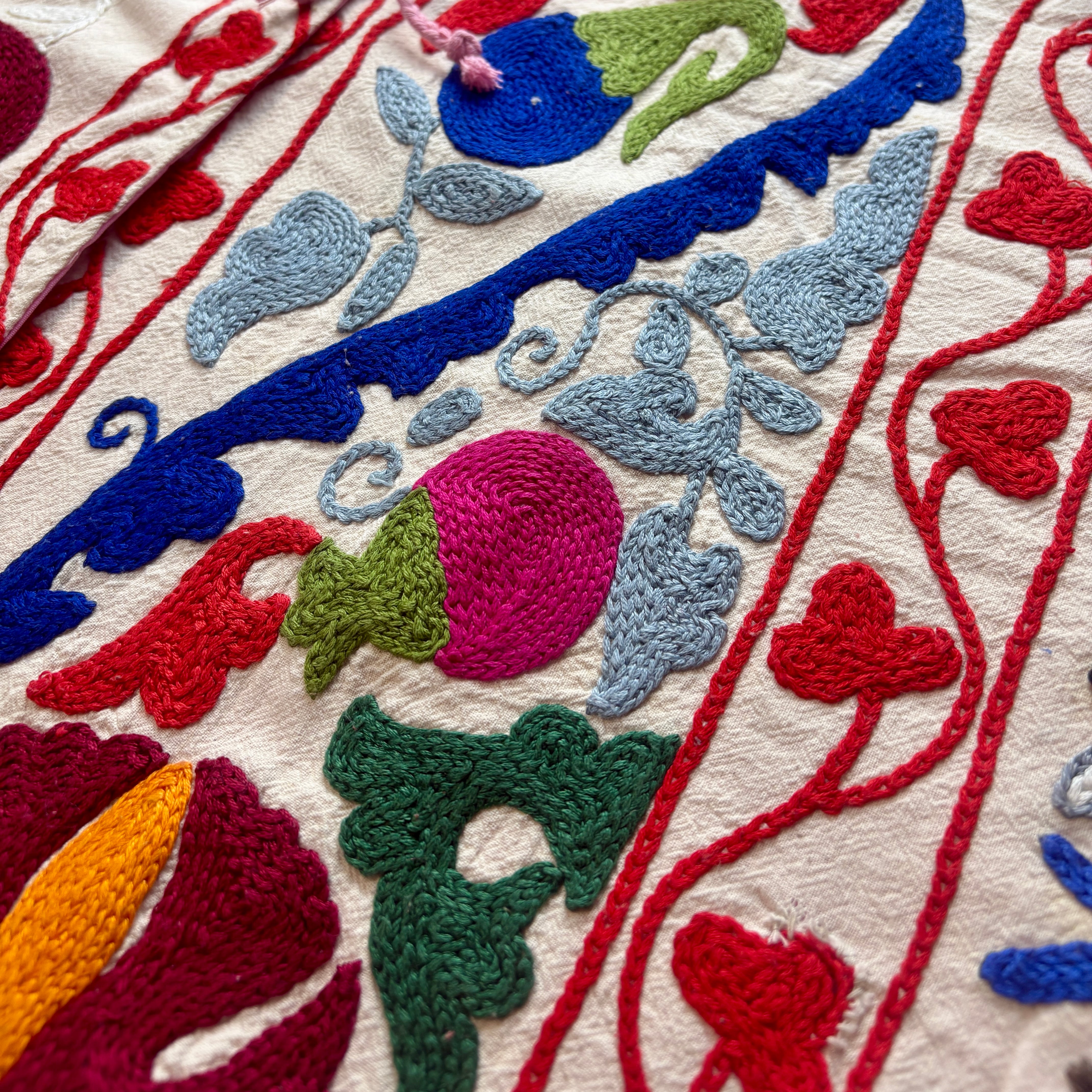 カザフスタンからウズベキスタン・キルギス・タジキスタン・トルクメニスタン・アフガニスタンにかけて広く見られる伝統技法で、チェーンステッチやカウチングステッチによってびっしりと施された刺繍には立体感があり、中央アジアならではの美しい配色や繊細な絵柄が表現されています。