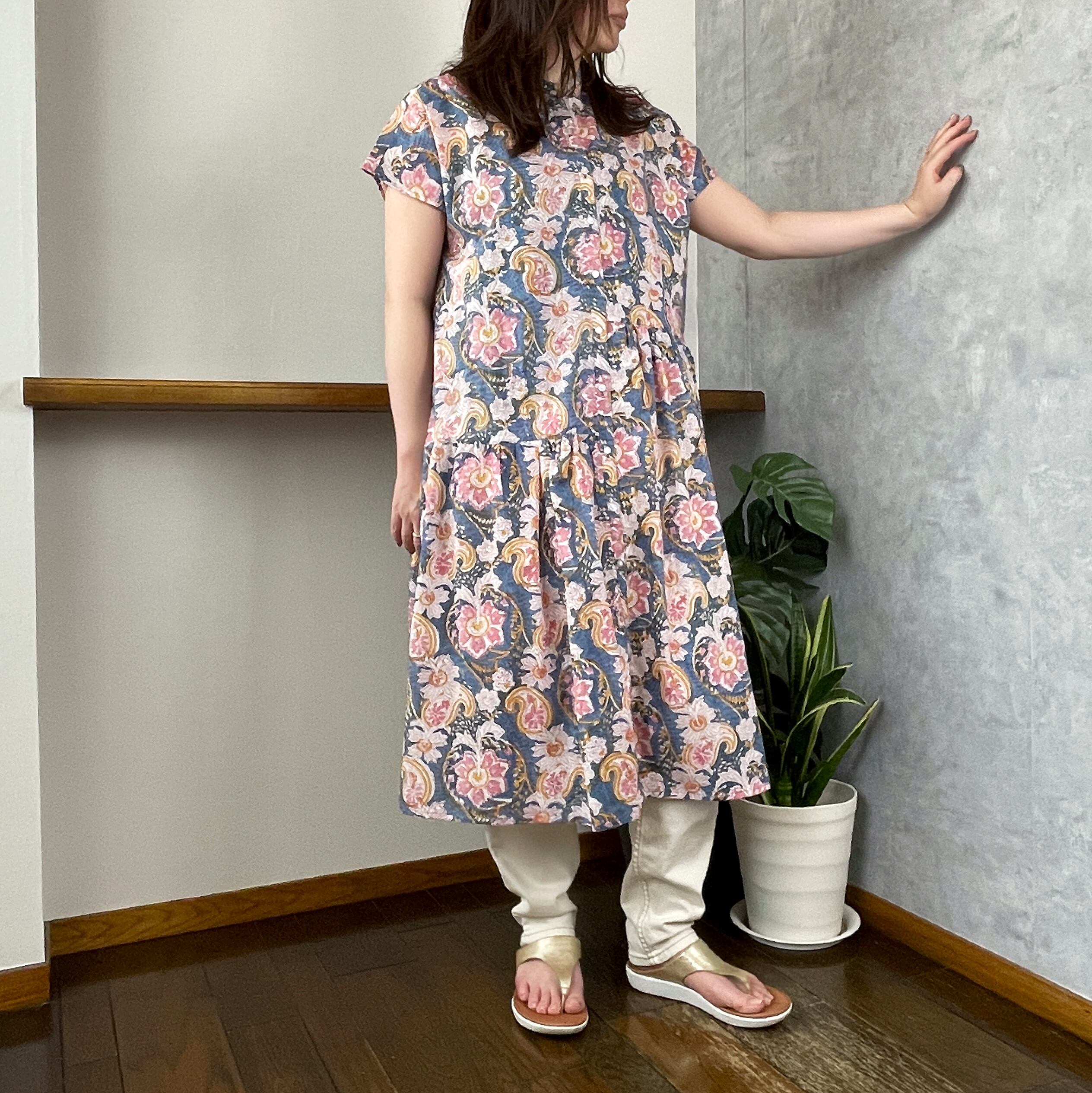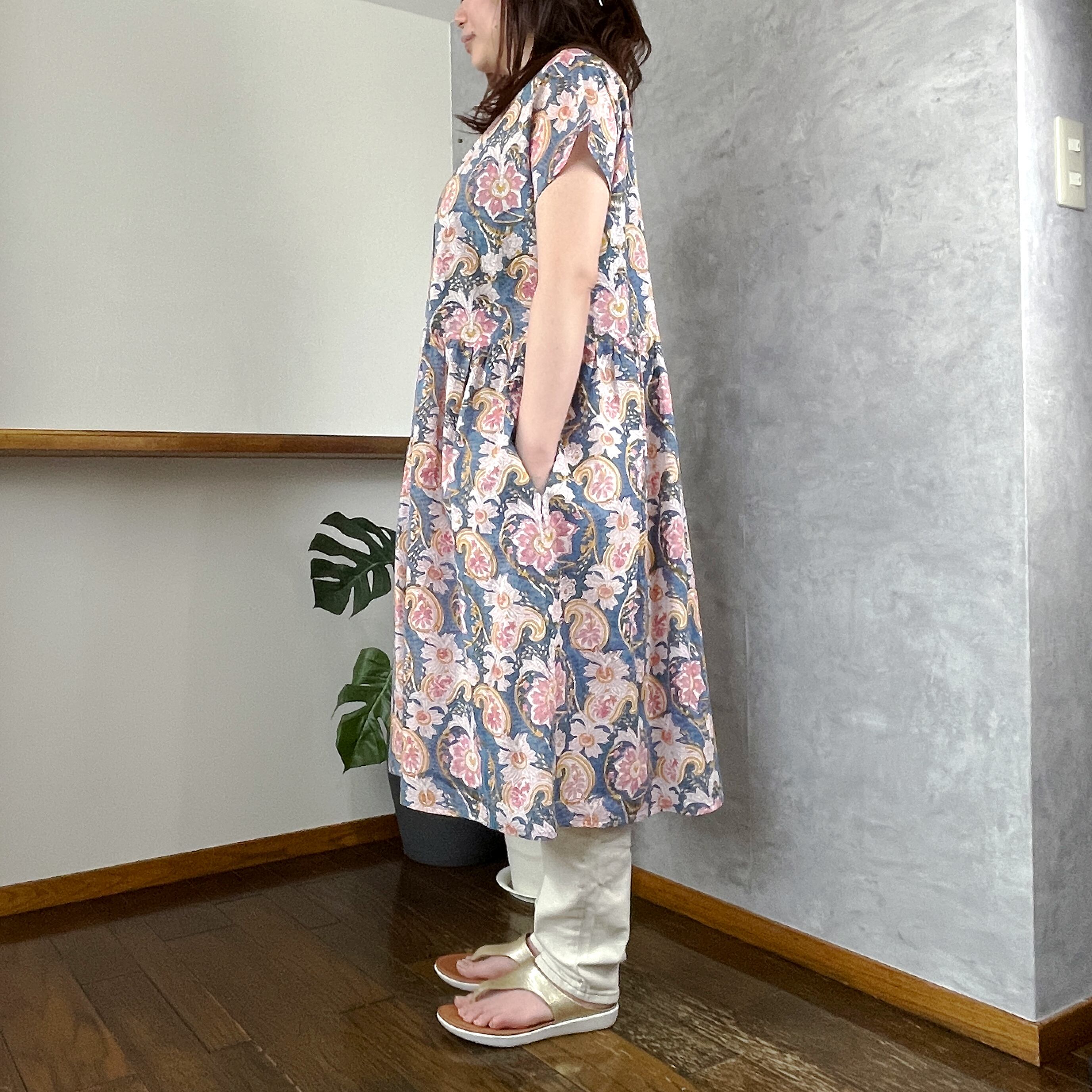 人気のフレンチスリーブワンピースに左右互い違いにギャザーを施しました。